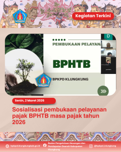 BPKPD melaksanakan sosialisasi pembukaan pelayanan pajak BPHTB masa pajak tahun 2026. Sosialisasi dilaksanakan melalui media Zoom oleh Kepala Bidang Perencanaan, Pengembangan dan Penetapan Pendapatan Daerah. Sosialisasi diberikan kepada seluruh PPAT dan Staf yang ada di Kabupaten Klungkung. Salah satu poin sosialisasi adalah perubahan aplikasi pelayanan menjadi “MAHOTTAMA” dan berlakunya SK NJOP 2026.